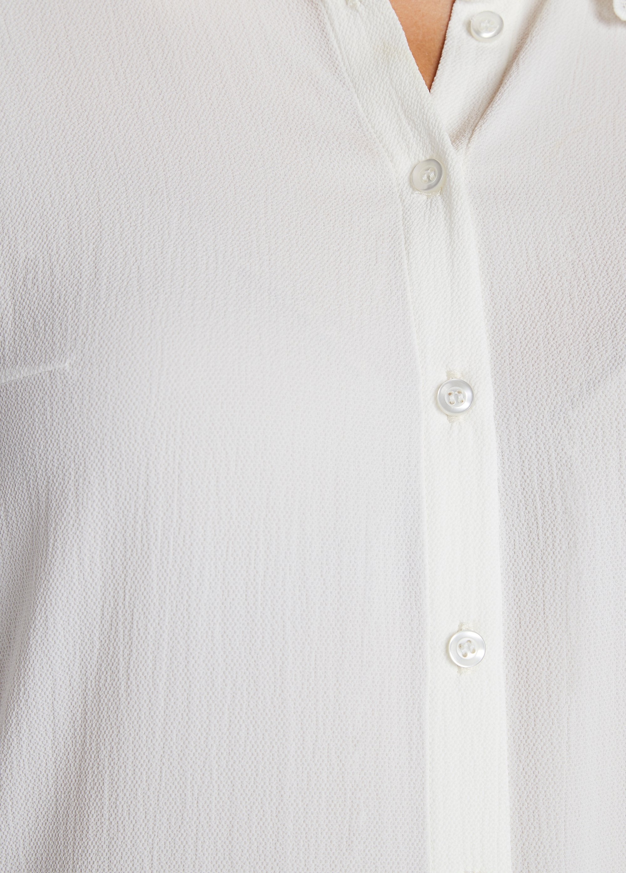 The refined blouse. Small collar mounted on a collar stand, highlighted with a fancy finish with studded and fishnet detail. Placket. Long sleeves, buttoned cuffs. Square back yoke. Rounded base.