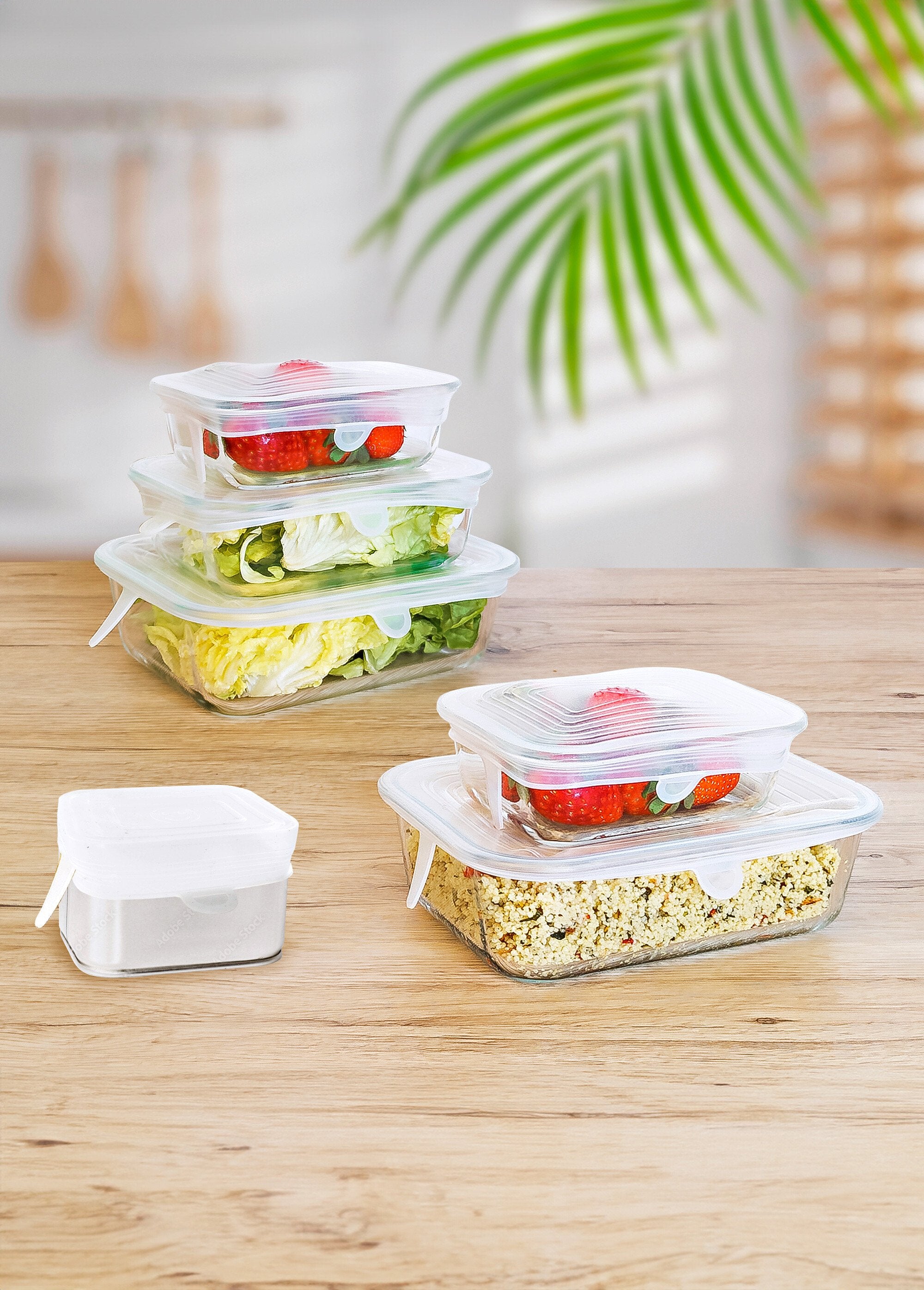 Resistant, extensible and waterproof, these 6 rectangular lids adapt to all types of dishes and containers. By covering them airtight, they increase the shelf life of food, preserving its taste and freshness. They withstand extreme temperatures, and can be used indefinitely from the freezer to the microwave.