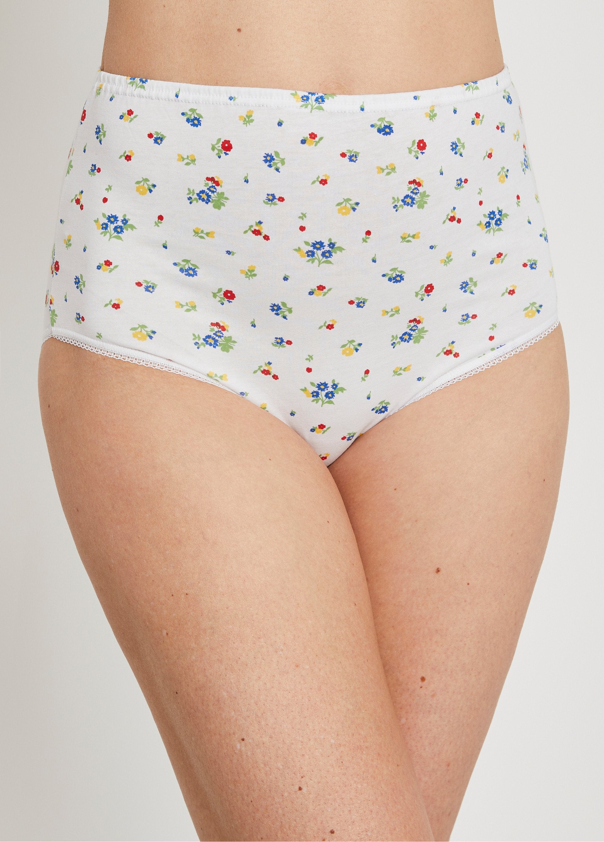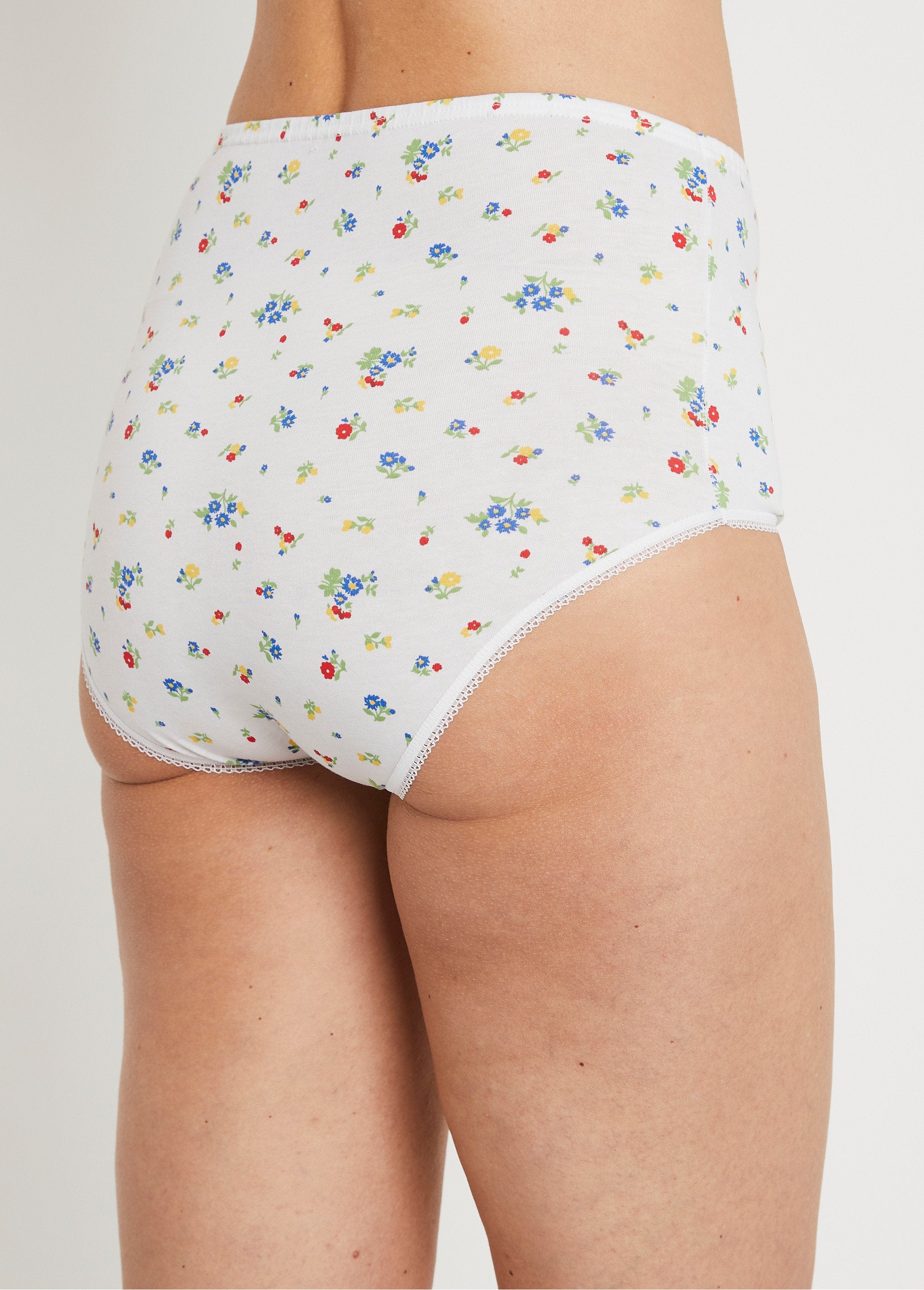Pack of 4 printed high-rise panties. Made in a soft and fresh pure combed cotton jersey, a good coverage shape with elastic under tunnel waist, elasticated picot legs and cotton-lined bottom for perfect comfort. Same size batch.