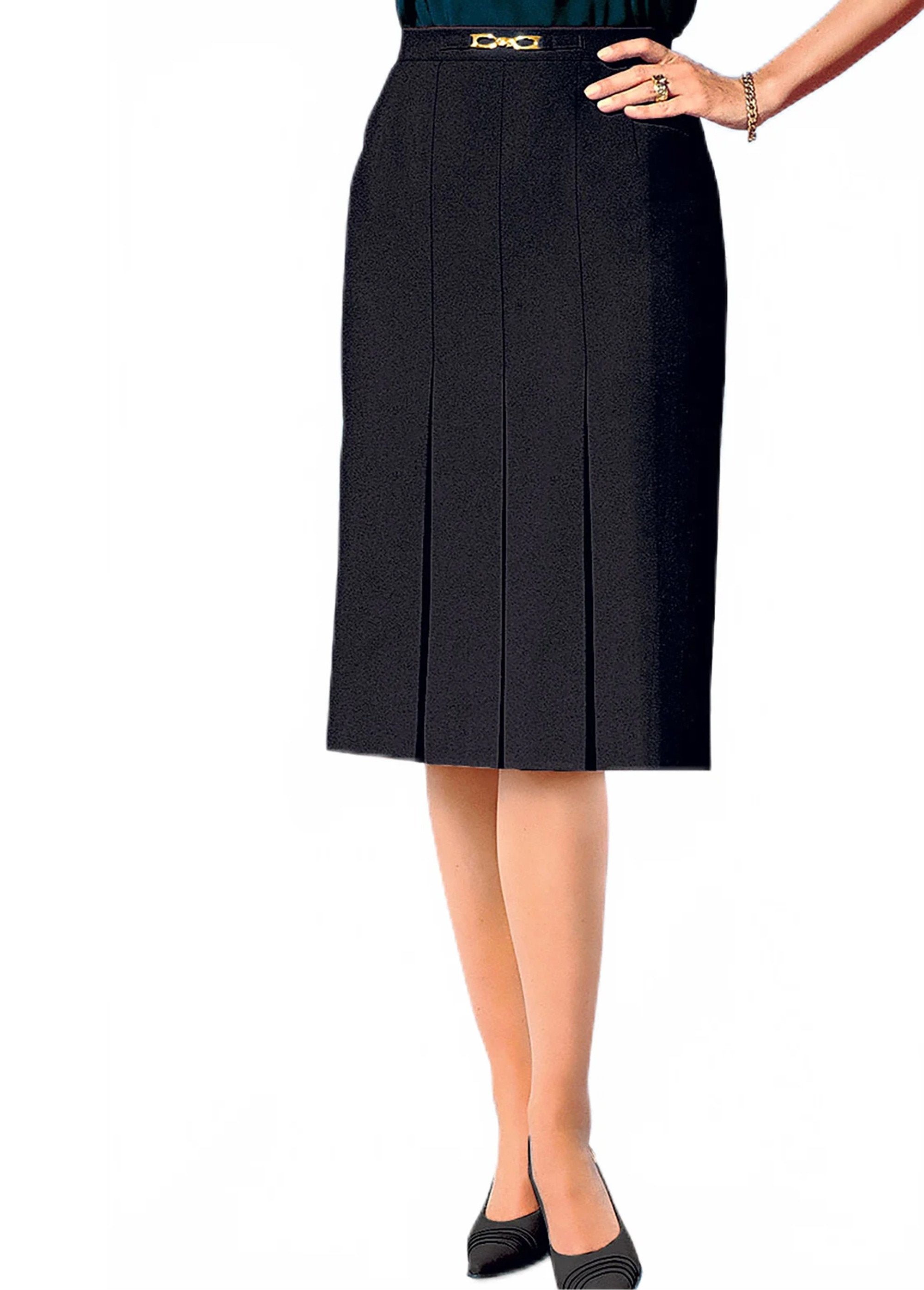 A skirt cut in a stretchy fabric that follows your movements while remaining impeccable, its line combines the well-being of an elasticated waistband on the back, the chic of a fancy buckle and the feminine ease of a set of topstitching opening into a box pleat and 2 folds lying in front. Darts at the front and back. Back closure with button and invisible zipper. Long. 65 cm approx. Washable. No need to iron. Polyester fabric.