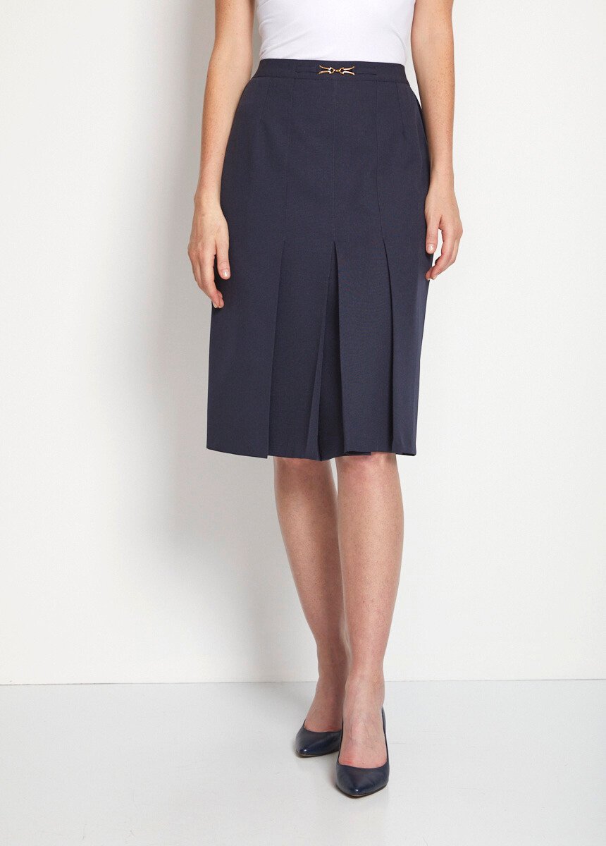 A skirt cut in a stretchy fabric that follows your movements while remaining impeccable, its line combines the well-being of an elasticated waistband on the back, the chic of a fancy buckle and the feminine ease of a set of topstitching opening into a box pleat and 2 folds lying in front. Darts at the front and back. Back closure with button and invisible zipper. Long. 65 cm approx. Washable. No need to iron. Polyester fabric.
