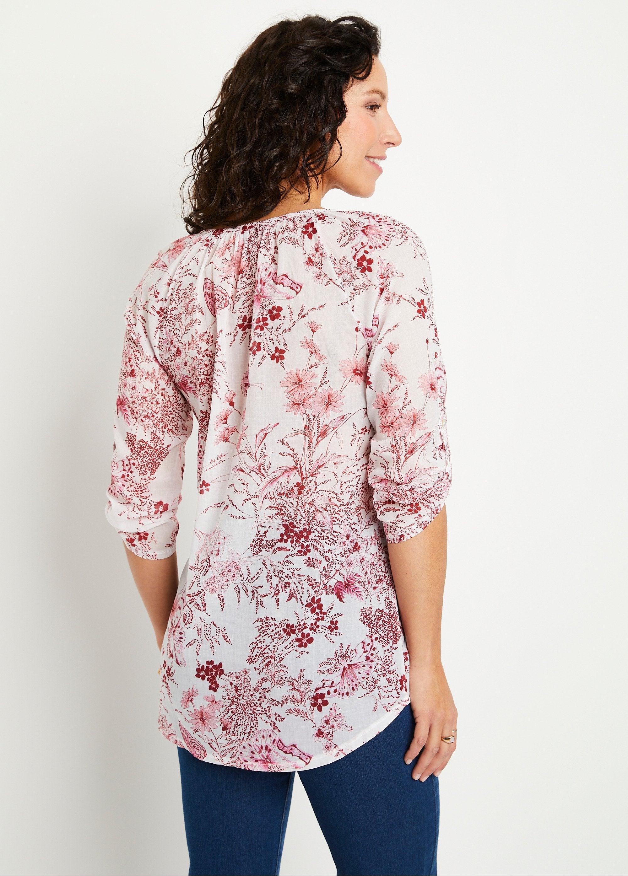 In fresh and light veil, the women's tunic ensures maximum comfort and femininity. Gathers under the neckline highlighted with a bias and raglan armholes for a nice fullness. Added button placket. Modular 3/4 sleeves with buttoned tab. Rounded base. Topstitched finishes.